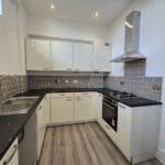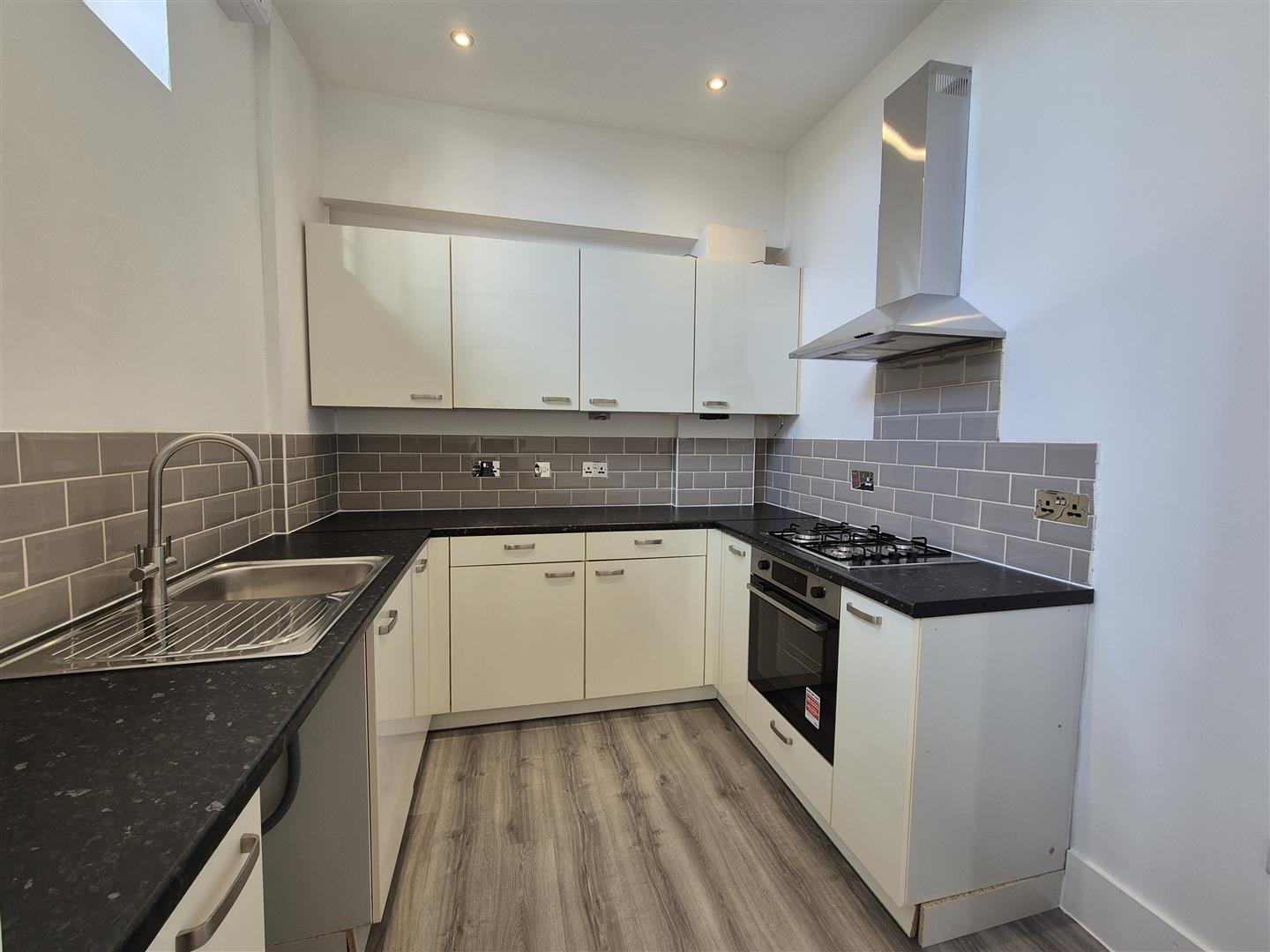 New LVT flooring, range of wall and base units with worktop over, stainless steel one and a half bowl sink drainer and mixer tap, electric oven, gas hob, single glazed window.