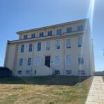 Driveway leading to secure gate into development, opening to kept grounds, parking, and access to buildings.