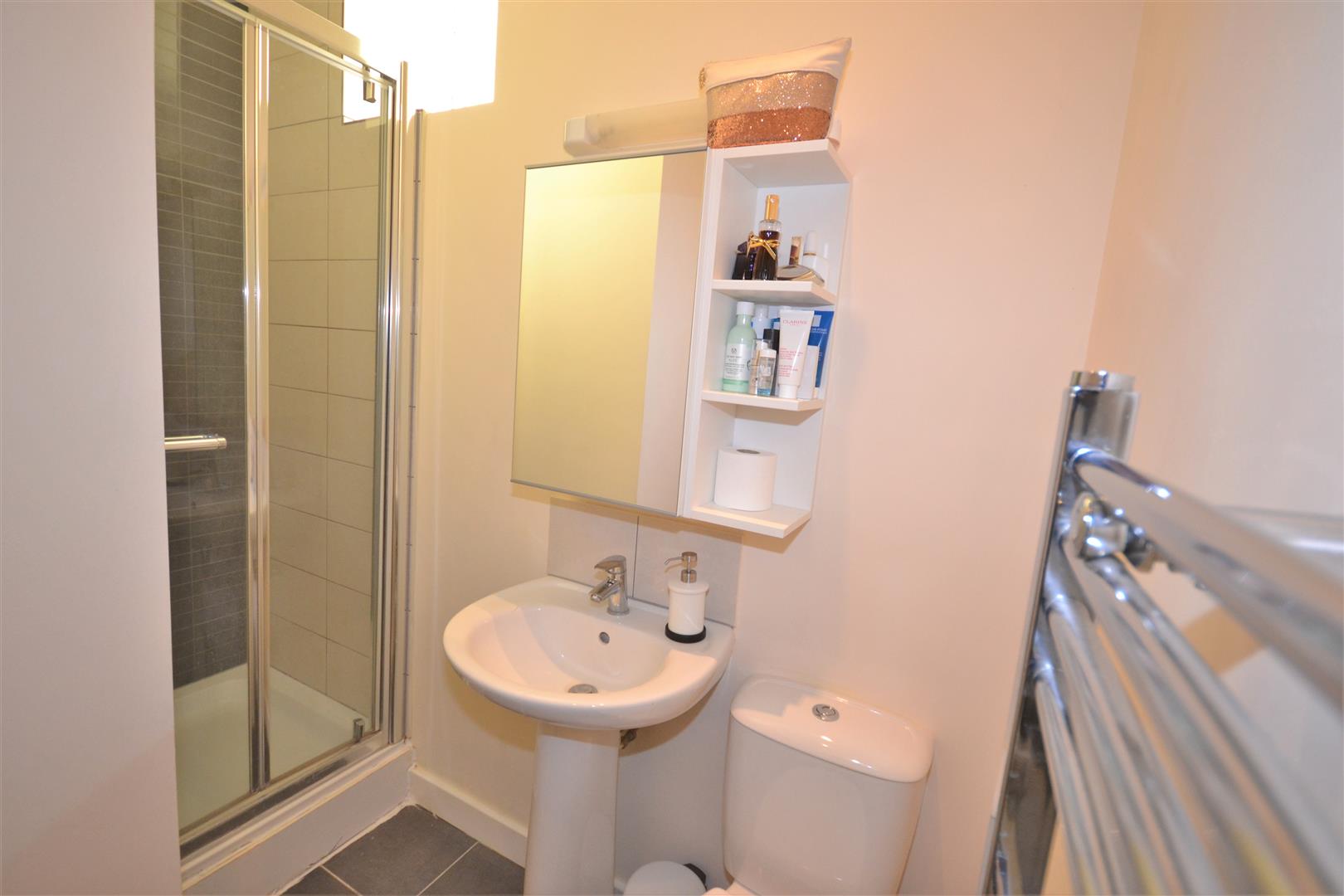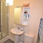Tiled flooring, heated towel radiator, shower cubicle, basin, w/c, mirrored wall unit, window to side and cupboard housing hot water cylinder and electric boiler.
