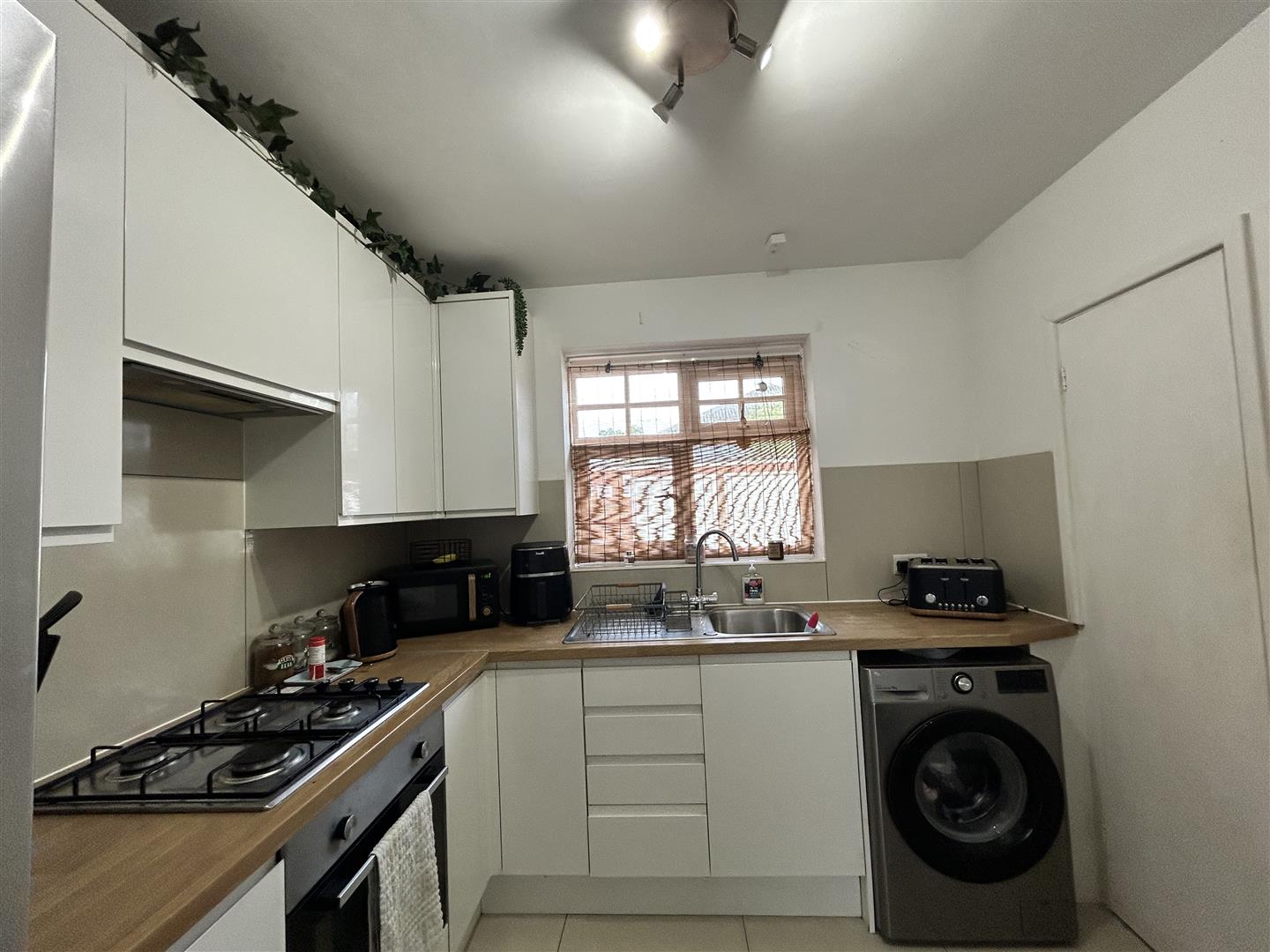Range of wall and base units with worktop over, stainless steel sink drainer and mixer tap, electric oven and gas hob, space and plumbing for washing machine, space for freestanding fridge freezer, UPVC window, two larder style cupboards one housing boiler and one housing consumer unit. Tiled floor, part tiled walls. Radiator,