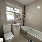 Tiled floor and walls, white suite comprising: bath with shower over, basin, w/c, radiator, UPVC window.